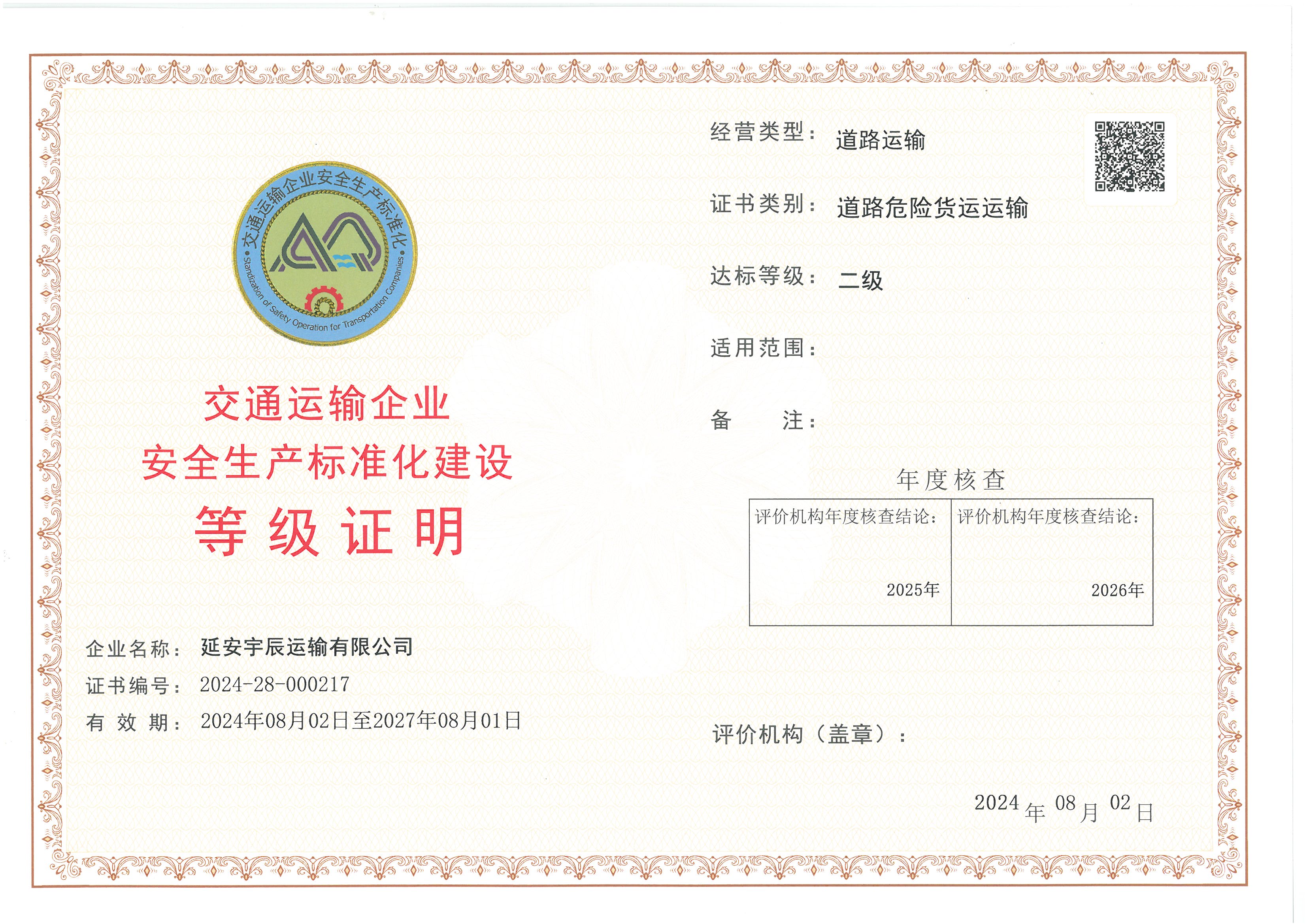 延安宇辰运输有限公司等级达标证书